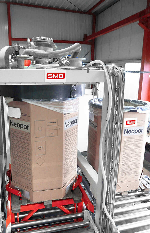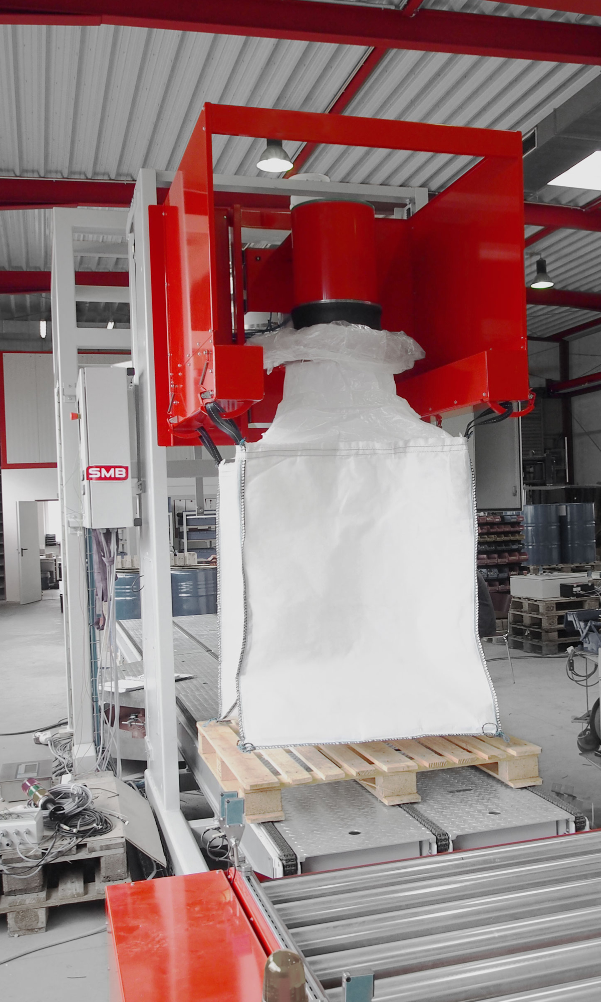 Anwendungsbeispiel: Unsere Abfüllanlage befördert Oktabin-Gebinde auf einer Palette zur Füllstelle. Dort wird diese angehoben und unter die Absaugplatte gedrückt. Nach der zwei- bis dreifachen Spülung mit Stickstoff beginnt der Füllvorgang aus einem vorab abgewogenen Edelstahlbehälter. Parallel sorgt eine Rütteleinheit für eine optimale Verteilung des Materials. Die verdrängte Luft wird in den Vorlagebehälter zurückgedrückt. Eine Ringabsaugung entfernt die eventuell entweichende Luft.