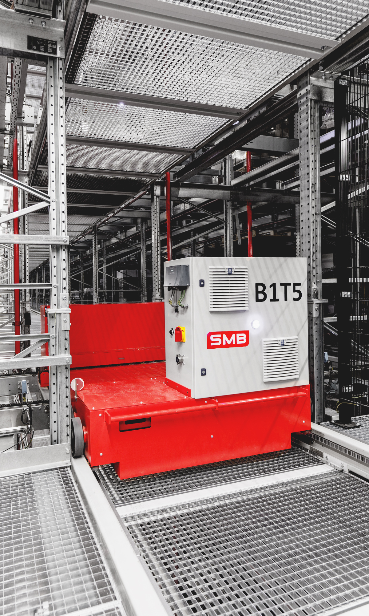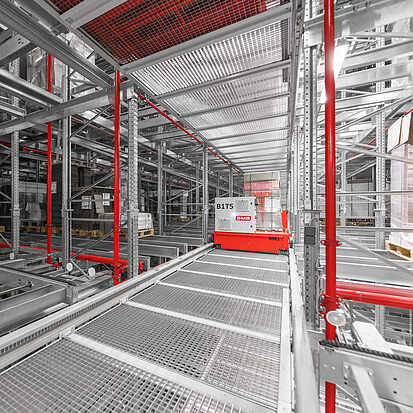 - Paletten-Shuttles – integriert in jeden Truck auf Lagerebene (Truck-Shuttle-System), transportieren jeweils bis zu 1500 kg Palettengewicht