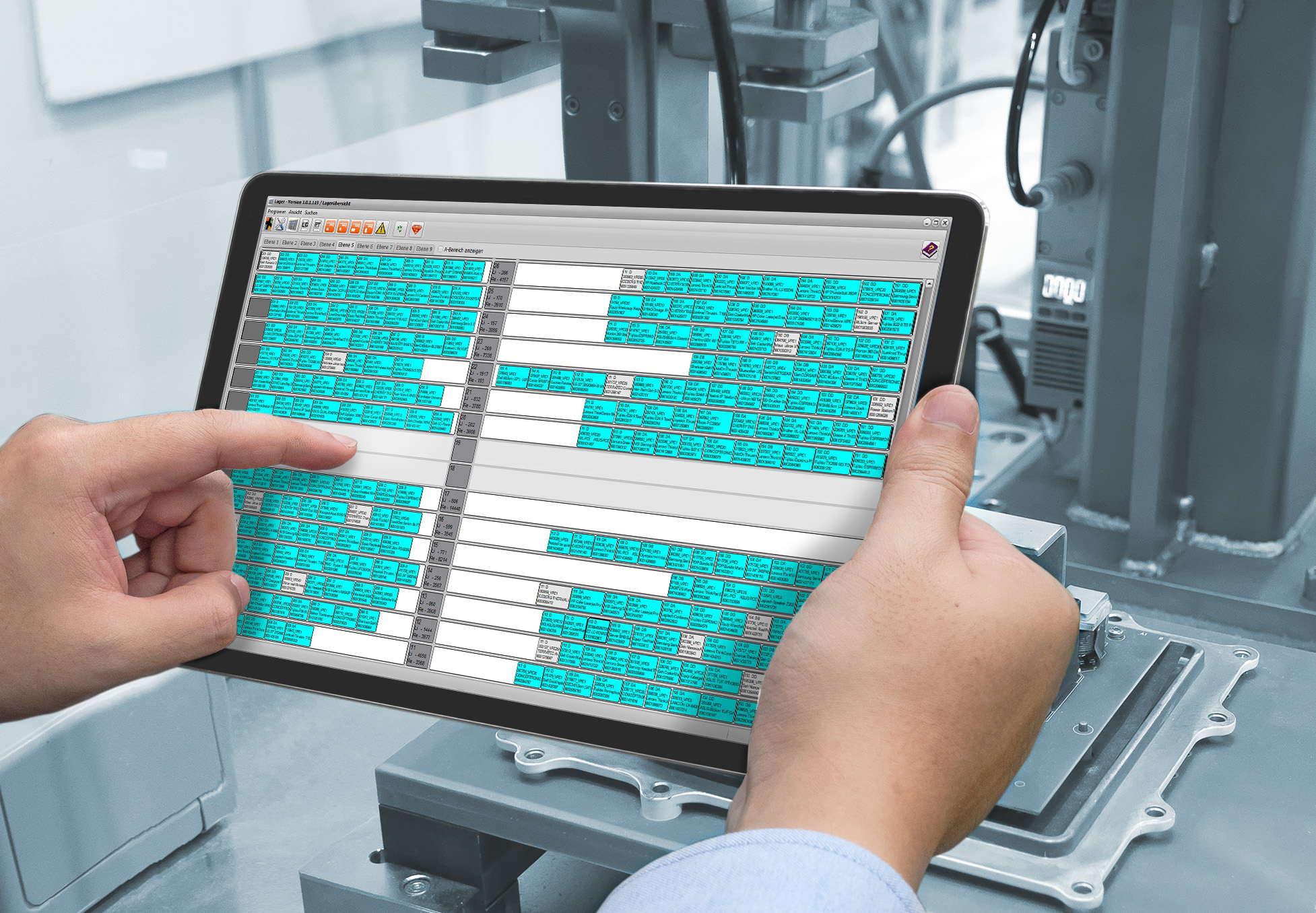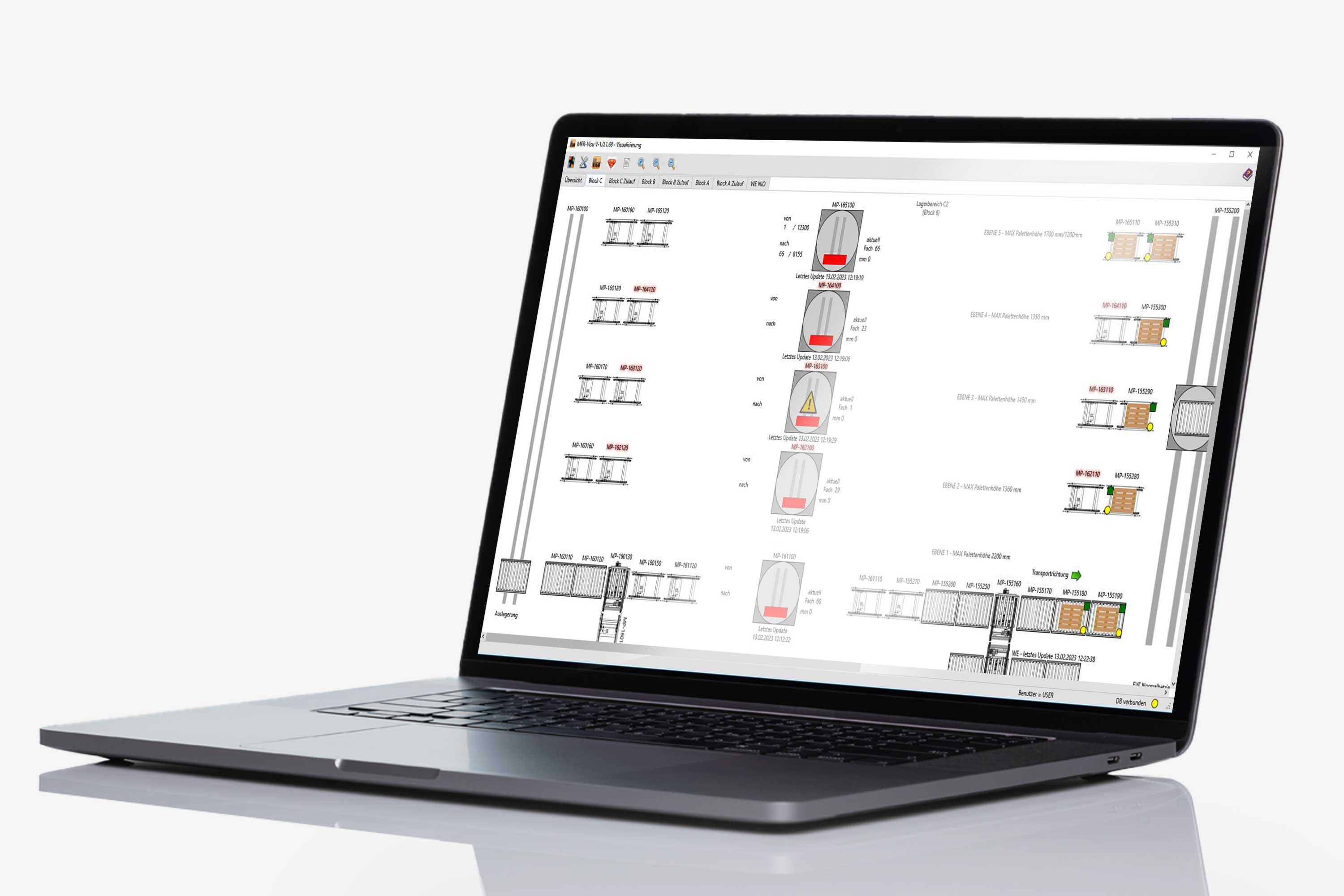 - die Materialflusssteuerung und Lagerverwaltungssoftware