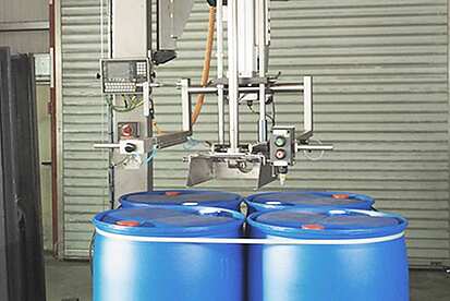 IBC und Paletten mit Gebinden werden auf der Plattformwaage abgestellt und per Gelenkarm befüllt.