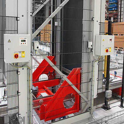 - Palettensenkrechtförderer (Rolle- oder Kettenausführung) mit Schnelllauftor