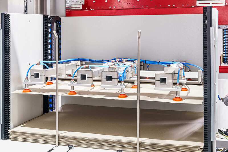 Unsere Lagenpalettierer können Zwischenlagen oder Kartonage zwischen die Lagen der Paletteneinheit legen. Dies dient zur Stabilisierung der Paletten und der Ladungsintegrität.